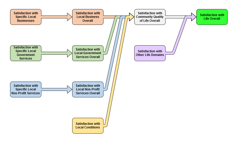 The Community-Quality-of-Life measure is essentially based on bottom-up theory of life satisfaction, a theory widely accepted in quality-of-life studies (e.g., Andrews and Withey, 1976; Campbell, Converse, & Rodgers, 1976). The basic premise of bottom-up theory is that life satisfaction of community residents is influenced by satisfaction they experience about their life domains and sub-domains. Specifically, life satisfaction is construed to be on top of a satisfaction hierarchy and is mostly determined by satisfaction with life domains (e.g., satisfaction with community, family, work, social life, health, and so on). Satisfaction with a particular life domain (e.g., satisfaction with community life), in turn, is influenced by lower levels of life concerns within that domain (e.g., satisfaction with services provided in the local community). Hence, residents who feel highly satisfied with their various life domains (i.e., high satisfaction with community life, health life, work life, family life, neighborhood life, and leisure life) are likely to express high levels of life satisfaction in general. The affect within those life domains spills over vertically to the most super-ordinate domain (life in general), thus determining life satisfaction. Similarly, satisfaction with community life is mostly determined by satisfaction with the life conditions/concerns associated with community life domain such as services and conditions in the community.