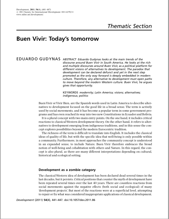 Buen Vivir or Vivir Bien, are the Spanish words used in Latin America to describe alternatives to development focused on the good life in a broad sense. The term is actively used by social movements, and it has become a popular term in some government programs and has even reached its way into two new Constitutions in Ecuador and Bolivia.
