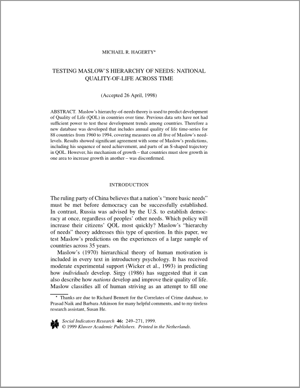 Testing Maslow’s Hierarchy of Needs: National Quality-of-Life Across Time