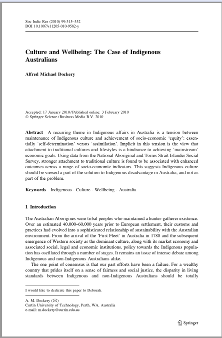 A recurring theme in Indigenous affairs in Australia is a tension between maintenance of Indigenous culture and achievement of socio-economic ‘equity’: essentially ‘self-determination’ versus ‘assimilation’. Implicit in this tension is the view that attachment to traditional cultures and lifestyles is a hindrance to achieving ‘mainstream’ economic goals. Using data from the National Aboriginal and Torres Strait Islander Social Survey, stronger attachment to traditional culture is found to be associated with enhanced outcomes across a range of socio-economic indicators. This suggests Indigenous culture should be viewed a part of the solution to Indigenous disadvantage in Australia, and not as part of the problem.