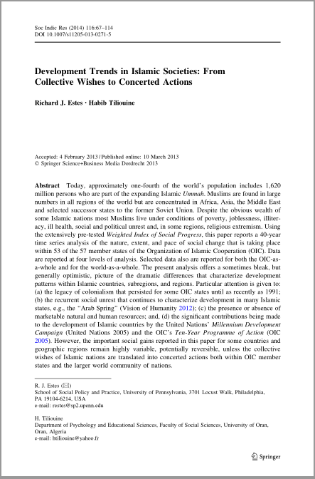Today, approximately one-fourth of the world’s population includes 1,620 million persons who are part of the expanding Islamic Ummah. Muslims are found in large numbers in all regions of the world but are concentrated in Africa, Asia, the Middle East and selected successor states to the former Soviet Union. Despite the obvious wealth of some Islamic nations most Muslims live under conditions of poverty, joblessness, illiteracy, ill health, social and political unrest and, in some regions, religious extremism. Using the extensively pre-tested Weighted Index of Social Progress, this paper reports a 40-year time series analysis of the nature, extent, and pace of social change that is taking place within 53 of the 57 member states of the Organization of Islamic Cooperation (OIC). Data are reported at four levels of analysis. Selected data also are reported for both the OIC-as-a-whole and for the world-as-a-whole. The present analysis offers a sometimes bleak, but generally optimistic, picture of the dramatic differences that characterize development patterns within Islamic countries, subregions, and regions. Particular attention is given to: (a) the legacy of colonialism that persisted for some OIC states until as recently as 1991; (b) the recurrent social unrest that continues to characterize development in many Islamic states, e.g., the ‘‘Arab Spring’’ (Vision of Humanity 2012); (c) the presence or absence of marketable natural and human resources; and, (d) the significant contributions being made to the development of Islamic countries by the United Nations’ Millennium Development Campaign (United Nations 2005) and the OIC’s Ten-Year Programme of Action (OIC 2005). However, the important social gains reported in this paper for some countries and geographic regions remain highly variable, potentially reversible, unless the collective wishes of Islamic nations are translated into concerted actions both within OIC member states and the larger world community of nations.