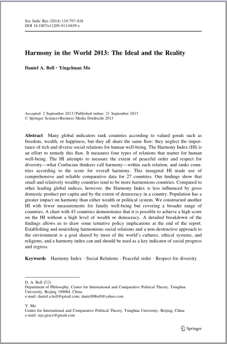 Many global indicators rank countries according to valued goods such as freedom, wealth, or happiness, but they all share the same flaw: they neglect the importance of rich and diverse social relations for human well-being. The Harmony Index (HI) is an effort to remedy this flaw. It measures four types of relations that matter for human well-being. The HI attempts to measure the extent of peaceful order and respect for diversity—what Confucian thinkers call harmony—within each relation, and ranks countries according to the score for overall harmony. This inaugural HI made use of comprehensive and reliable comparative data for 27 countries. Our findings show that small and relatively wealthy countries tend to be more harmonious countries. Compared to other leading global indices, however, the Harmony Index is less influenced by gross domestic product per capita and by the extent of democracy in a country. Population has a greater impact on harmony than either wealth or political system. We constructed another HI with fewer measurements for family well-being but covering a broader range of countries. A chart with 43 countries demonstrates that it is possible to achieve a high score on the HI without a high level of wealth or democracy. A detailed breakdown of the findings allows us to draw some tentative policy implications at the end of the report. Establishing and nourishing harmonious social relations and a non-destructive approach to the environment is a goal shared by most of the world’s cultures, ethical systems, and religions, and a harmony index can and should be used as a key indicator of social progress and regress.