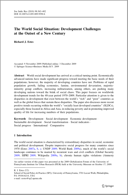 World social development has arrived at a critical turning point. Economically advanced nations have made significant progress toward meeting the basic needs of their populations; however, the majority of developing countries have not. Problems of rapid population growth, failing economies, famine, environmental devastation, majority-minority group conflicts, increasing militarization, among others, are pushing many developing nations toward the brink of social chaos. This paper focuses on worldwide development trends for the 40-year period 1970–2009. Particular attention is given to the disparities in development that exist between the world’s “rich” and “poor” countries as well as the global forces that sustain these disparities. The paper also discusses more recent positive trends occurring within the world’s “socially least developed countries” (SLDCs), especially those located in Africa and Asia, in reducing poverty and in promoting improved quality of life for increasing numbers of their populations.