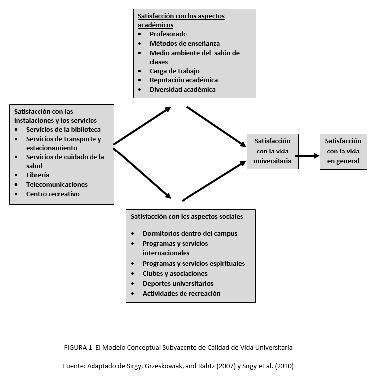 El modelo conceptual en el cual descansa la encuesta de calidad de vida universitaria (ECVU) se muestra en la Figura 1 que se muestra a continuación (Sirgy, Grzeskowiak, & Rahtz, 2007; Sirgy et al., 2010). Como se muestra en la figura, la satisfacción con la vida en general (indicador de la encuesta: “¿Qué tan satisfecho se encuentra con su vida en general?” cuya respuesta se captura en una escala de satisfacción de 5 puntos) para los estudiantes universitarios se ve altamente afectada por la satisfacción con la vida universitaria (indicador de la encuesta: “En general, ¿qué tan satisfecho se encuentra usted con la vida estudiantil en la Universidad (nombre de la universidad)?”).